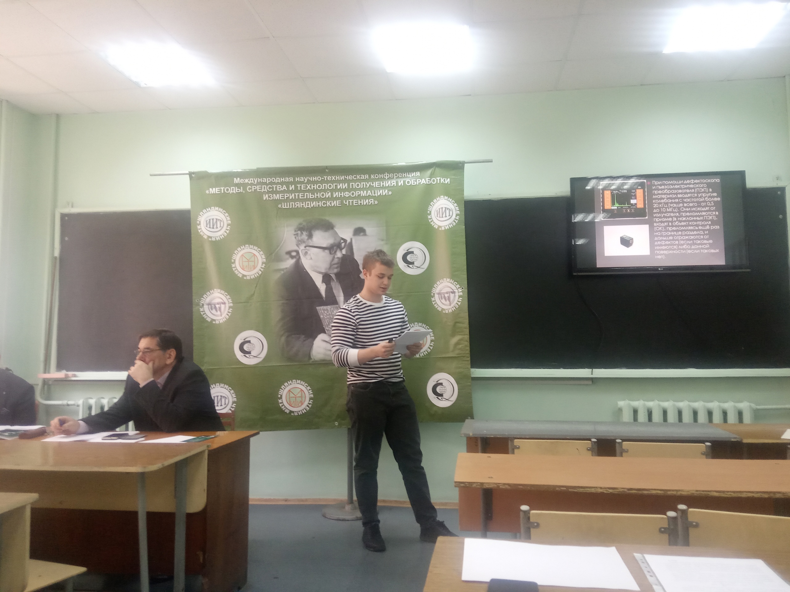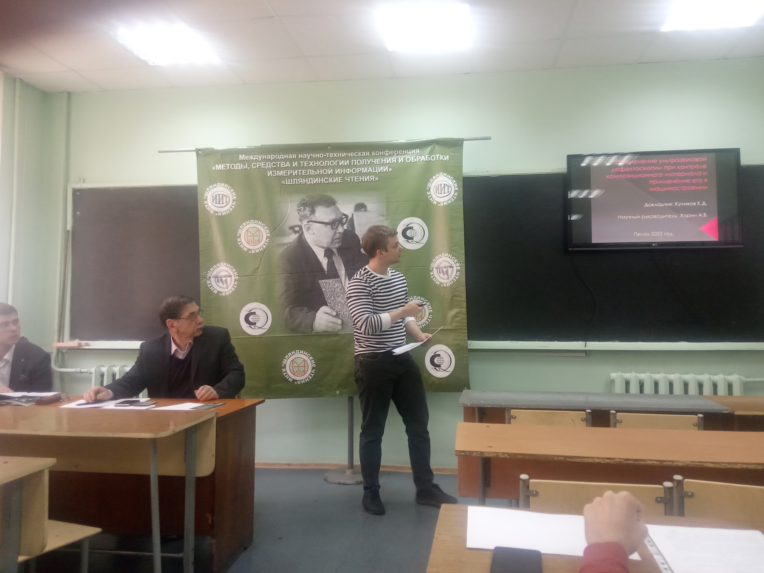 В секции №8 «Новые материалы и технологии» с докладом «Применение ультразвуковой дефектоскопии при контроле композиционного материала и применение его в машиностроении» выступил Куликов К.Д., с докладом «Кузнечная сварка» выступил Мошаров Е.А. Научный руководитель доцент каф. КиИМ Хорин А.В.